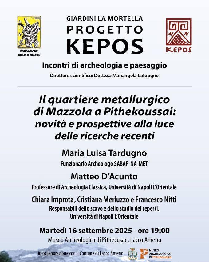 Martedì 16 Settembre alle ore 19:00 presso Villa Arbusto si svolgerà il settimo appuntamento del ciclo di conferenze del Progetto Kepos, Incontri di Archeologia e Paesaggio, voluto dalla Fondazione W. Walton e Giardini La Mortella in sinergia col Comune di Lacco Ameno e dedicato alla ripresa delle attività di scavo nel sito di Mazzola sulla collina di Mezzavia a Lacco Ameno.